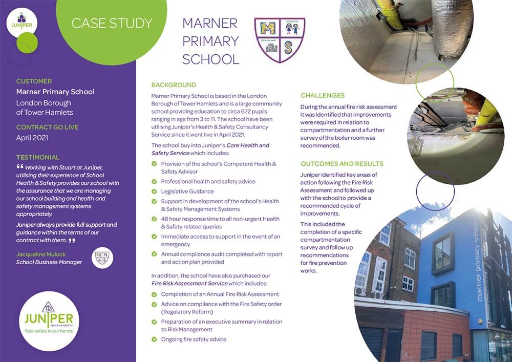 “Here at John Scurr we have been really impressed by what Juniper have to offer through their Health and Safety consultancy offer for schools. Having worked with Stuart McGregor for many years as a LB Tower Hamlets school it is now completely re-assuring to be able to reach out to him with issues, queries or requests, be they large or small, knowing that he already has an extensive knowledge of our context and building.